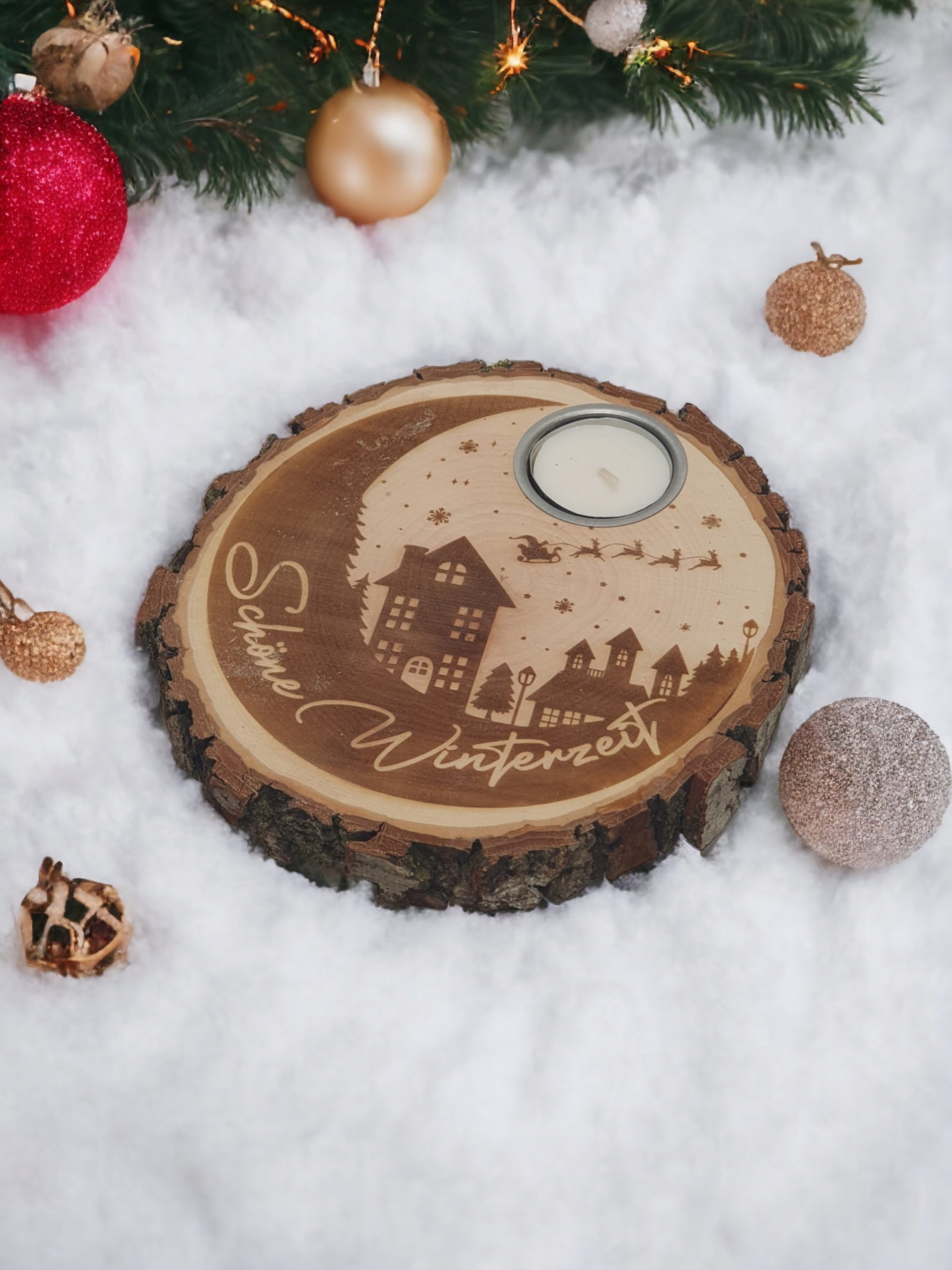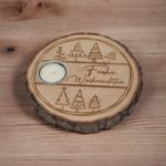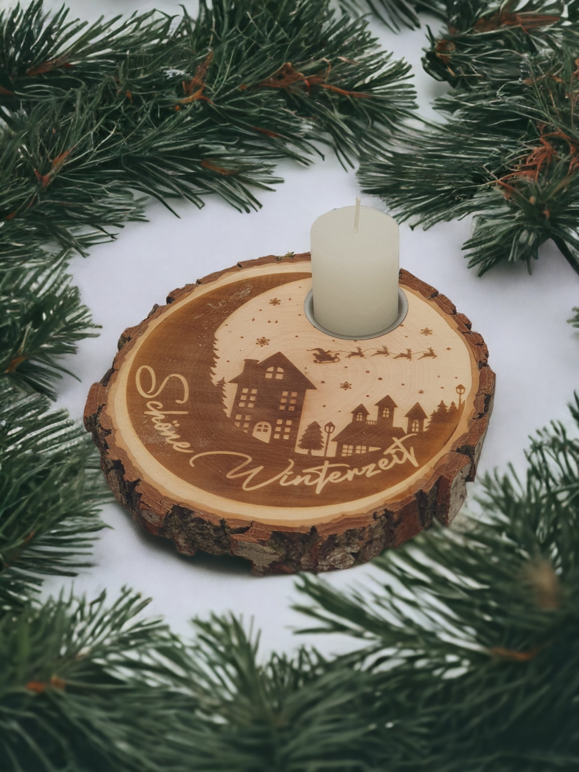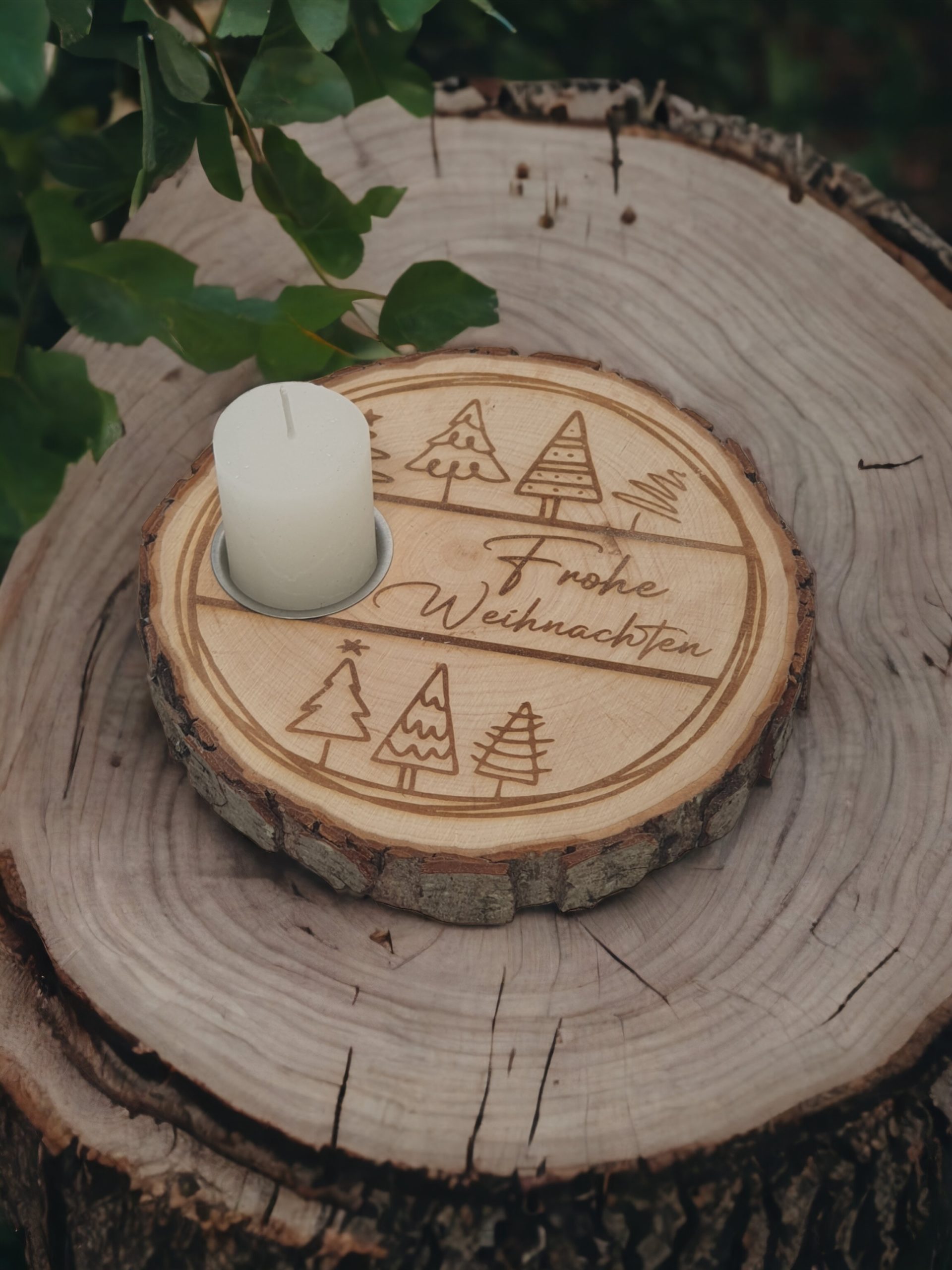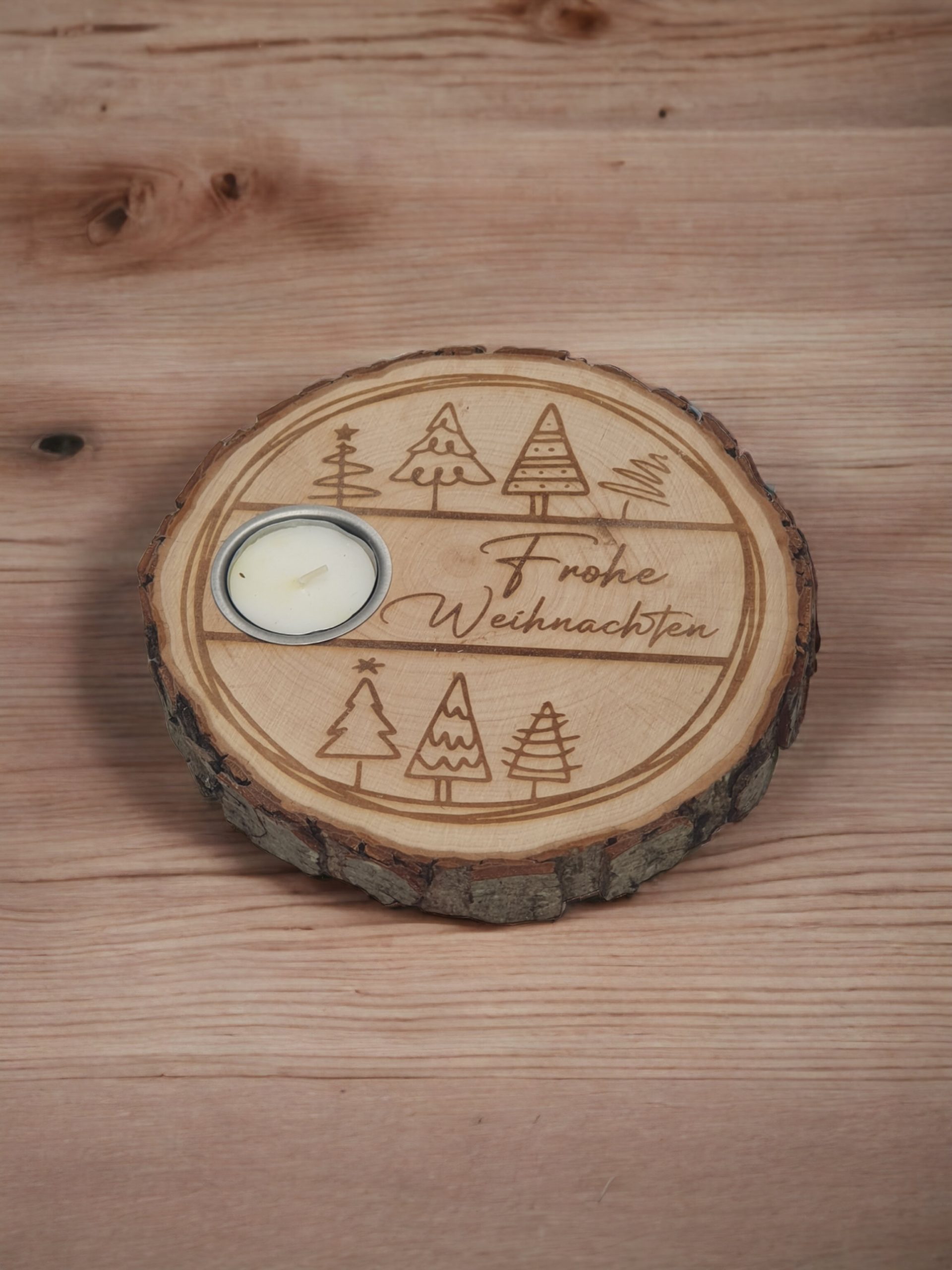 - Kerzenhalter Holzschiebe graviert Scheibe mit Rinde = 8,50€